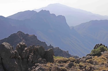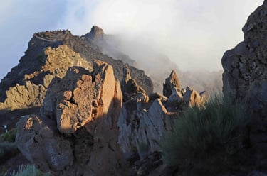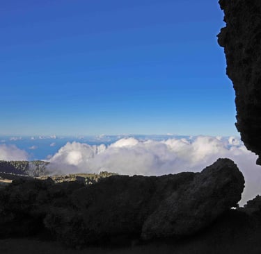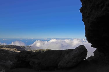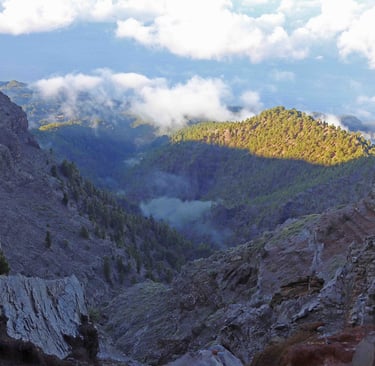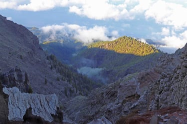 <- Les Roque de los Muchachos n'ont rien d'exceptionnel, sinon que c'est le point culmi-nant de l'ile, mais il faut suivre le petit chemin qui les contourne pour avoir une vue ma-gique sur les rochers dominant la caldera baignés à la fois dans le soleil et les nuages. Puis retour sur Santa Cruz ->