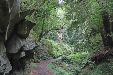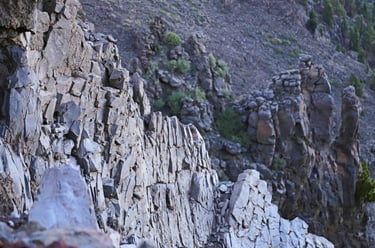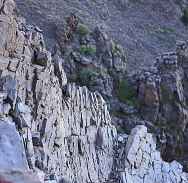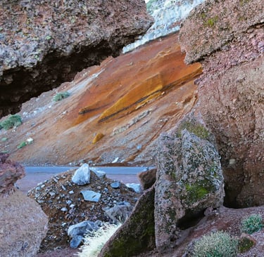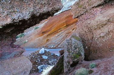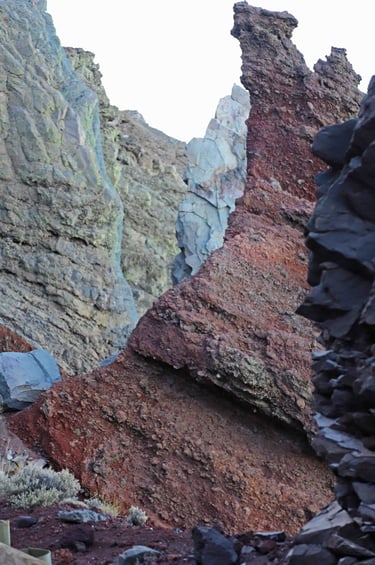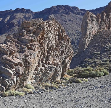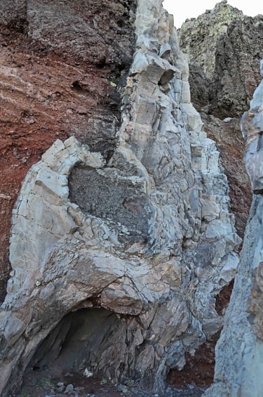 En rebroussant chemin, nous rencontrons d'autres paysages, comme cet ensemble rocheux qui dénote par rapport à son envi-ronnement grisâtre ou cette barre en for-me d'épine dorsale brisée d'un gigantes-que animal venu des profondeurs de l'ima-gination.