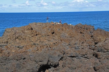 champs de bananes à perte de vue. En descendant , sur la droite, un bâtiment avec des cabines pour se changer et derrière, une douche payante (1€) pour se dessaler. Au premier abord, l'eau paraît froide mais il suffit de quelques minutes pour s'y faire. Sur la gauche, un restau-rant; sur la droite, des pêcheurs sur un monticule de lave et des vagues assez agressives qui s'écrasent dessus.