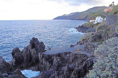 Après cette première baignade, il nous faut trouver un endroit où déjeuner. Le problème de venir en basse saison , c'est qu'une bonne partie des restaurants sont fermés, en particulier celui que j'avais repéré dans le coin. Nous avons finalement opté pour la sympathique terrasse du Restaurante Mesón del Mar qui surplombe un petit port à proximité des piscines de Charco Azul où nous avons mangé une paella et un poulpe. L'accueil du patron est assez froid mais la paella n'est pas chère et l'endroit agréable. Puis nous avons été faire un tour à San Andres et aux piscines de Charco Azul. Des piscines, on peut longer la côte jusqu'à San Andres par un agréable chemin.