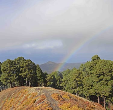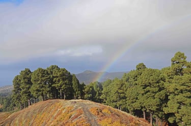 Décidément si les couchers sont inexistants sur cette ile, elle se rattrape avec les arcs en ciel; ici il est même doublé. Lorsque la nuit commence à tomber, nous repartons vers notre logement en longeant la côte et les bananeraies. Demain c'est notre dernier jour sur La Palma; nous avons prévu une randonnée jusqu'au mirador de la Cumbrecita. La randonnée grimpe dans les sapins, puis le chemin disparaît et il n'y a pas d'indications. Il faut alors bifurquer à droite vers la paroi rocheuse et continuer dans la même direc-tion qu'initialement. Ca devient alors plus intéressant, par contre j'ai été déçu par la vue sur la caldera depuis le mirador. C'est plus impressionnant vu de la crête.