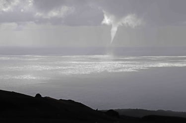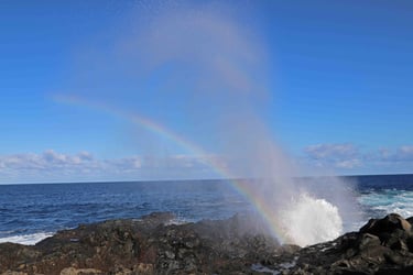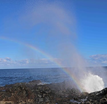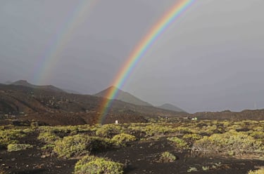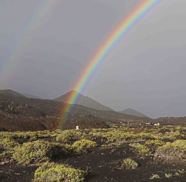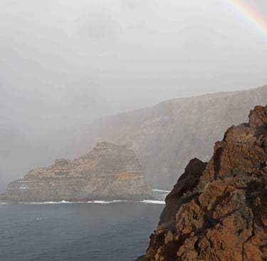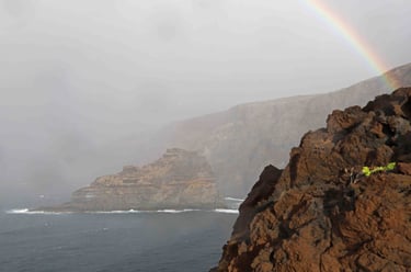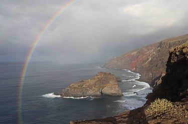 Revenons à ce troisième jour. Après avoir traversé le parc de Taburiente par la route LP-4 sous une tempête d'eau et de vent, nous arrivons au Nord-Ouest de l'ile et la tempête laisse la place à un bel arc en ciel. L'accalmie ne dure cependant que le temps de la visite du sympathique village de Santo Domingo. Sur cette ile, il est fréquent qu'il y ait sépara-