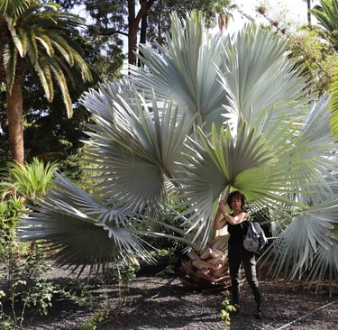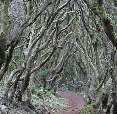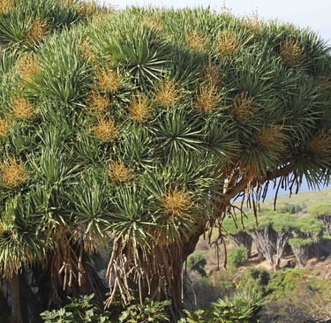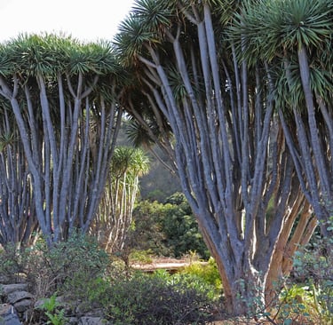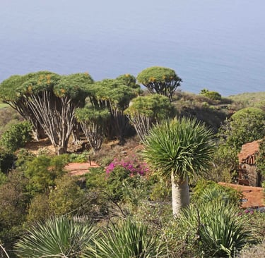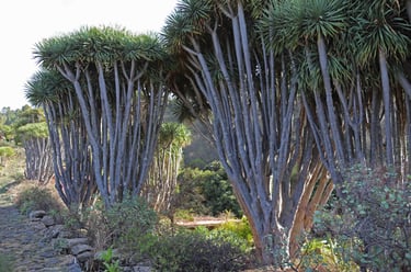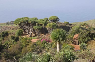 Trempés, il ne nous reste plus qu'à descendre jusqu'à Las Indias pour nous sécher dans notre nouveau logement. Si c'est bien plus éloigné que Santa Cruz de La Palma, comme nous évitons la montée et la descente de Caldera, la durée du trajet est bien plus courte. C'est pourquoi quelques jours plus tard, nous profiterons du beau temps pour revenir dans le coin, plus précisément à La Tricias pour une randonnée dans les dragonniers, ces curieux arbres en forme de parasol, emblèmes des Canaries, qu'on trouve également au Cap Vert, près de Tiznit au Maroc, mais également bientôt dans notre jardin. Une belle balade bien différente des précédentes avec, cerise sur le gâteau, Le site archéologique et ethnographique des Cuevas de Buracas dont certaines grottes sont décorées de pétroglyphes (figures géométriques en formes de spirales et de lignes ondulées).