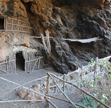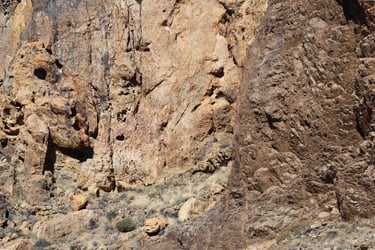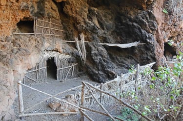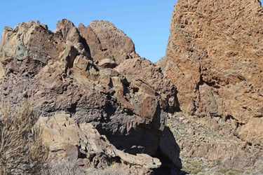 Le Roque Bentayga n'est qu'à 1400m. Lorsqu'on arrive à proximité, on devine que la main de l'homme est passée par là. Un pan de mur semble avoir été dressé pour en li-miter l'accès. Plus haut on constate que le sol a été travaillé et que des grottes ont été creusées. Il semblerait que cela ait été un lieu de prières.