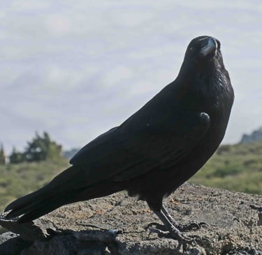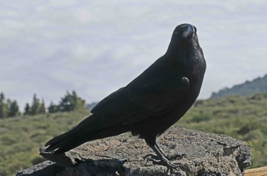 de la forêt, la pluie cesse momentanément, juste le temps de faire une pose au premier parking venu où un immense corbeau peu fa-rouche vient quémander un peu de nourriture. Nous sommes au dessus des nuages mais ça ne dure que le temps de quelques photos de notre clochard céleste. Ca n'est qu'à notre 3ème passage, quelques heures avant de reprendre de ferry pour Té- nérife que je pourrai enfin voir cette fameuse caldera.