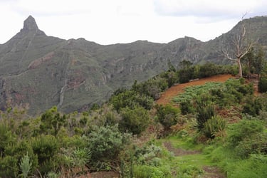 Les autres jours passés dans le nord de l'ile sont consacrés au Parc rural d'Anaga. Le premier jour, nous nous rendons à Benijo en passant par San Andres, puis la TF-12 pour re-descendre sur Taganana, puis Benijo, le but étant d'aller ensuite à pieds jusqu'à El Draguillo et voir s'il est possible d'aller plus loin. A El Draguillo, le chemin se sépare en 2. Je prends à gauche sur un chemin étroit mais praticable qui grimpe, mais 800m plus loin, il semble y avoir eu un éboulement de pierres qui le recouvre, et étant donné la pente abrupte sur la gauche, je préfère faire demi tour pour tenter l'autre voie. Celle ci monte au dessus du village mais après 40mn de montée, je réalise qu'il me faudra au moins au-tant de temps pour espérer voir mieux et je commence à avoir sérieusement faim. Donc retour à Benijo où nous nous installons au Restaurante Playa Casa Africa. Le poulpe en ragout composera notre 2ème excellent repas.