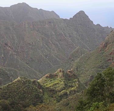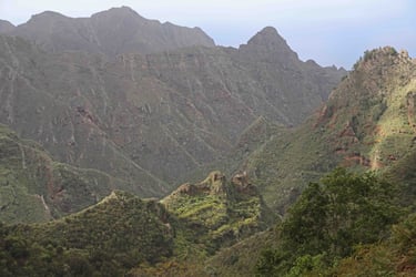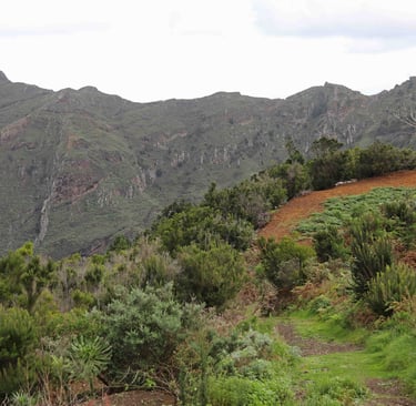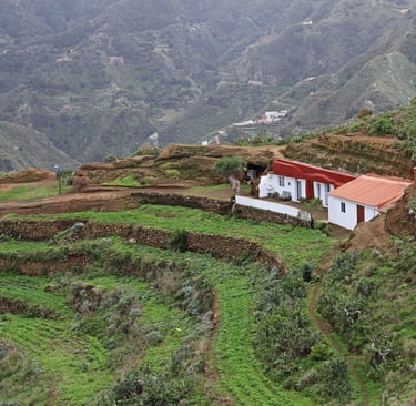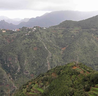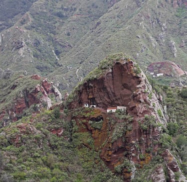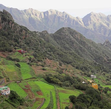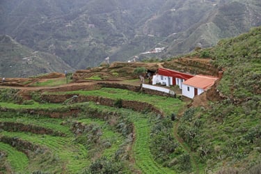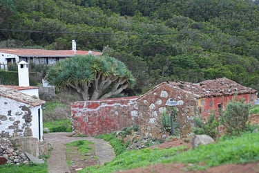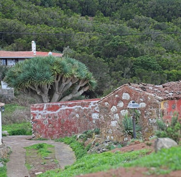 Le lendemain, c'est notre dernier jour dans le coin avant de descendre pour Los Silos dans le Nord-Ouest de l'ile de Ténérife. En attendant, nous prenons la direction de Chinamada pour l'ultime randonnée dans ce magnifique parc, qui commence un peu avant le parking de l'église rouge de San Ramon. L'habitat est très épars souvent composé de maisons semi troglodytes, devant des terrains cultivés en espaliers. Une fois notre appétit bien aiguisé, nous descendons sur Punta del Hidalgo où nous fai-sons encore une fois un excellent repas (une énorme daurade avec boissons et cafés pour moins de 30 € à 2) accompagnés de musiciens au Restaurante Casa Sánchez.