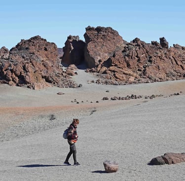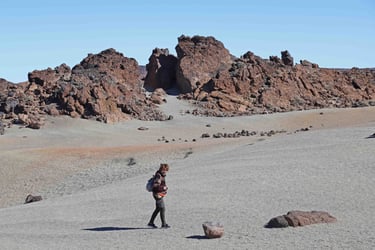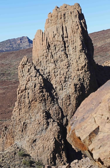 incontournables Roques de Garcia. Malgré que nous arrivions assez tôt et que les parkings soient nombreux, il est impossible de se garer à proxi-mité. La balade pour en faire le tour dure près de 2h et malgré le monde, l'endroit est véritablement magique. A tout seigneur, tout honneur la ba- lade commence par le célèbre Roque Chin- chano, un monolithe de basalte qui semble défier la loi de la gravité. D'autres semblent être les émanations de monstres préhisto- riques particulièrement inquiétants. Même à contre jour, on peut voir dans le Roque