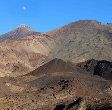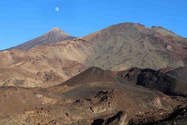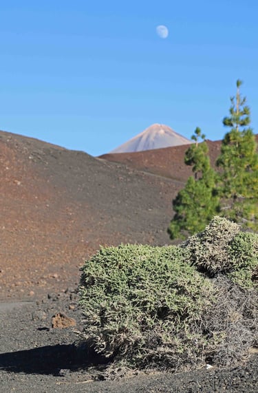 Enfin, en arrivant au mirador de Samara, j'ai encore le temps de faire une bonne partie d'une randonnée prévue initialement en direction du Pico Viejo malgré l'heure relativement avancée de la journée, comme le suggère cette facétieuse lune que semble vouloir happer le volcan.