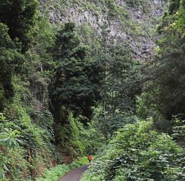 Dès les premiers km à l'intérieur de l'ile quand on vient de la côte nord, la route s'élève et la végétation s'intensifie, puis, à partir d'une