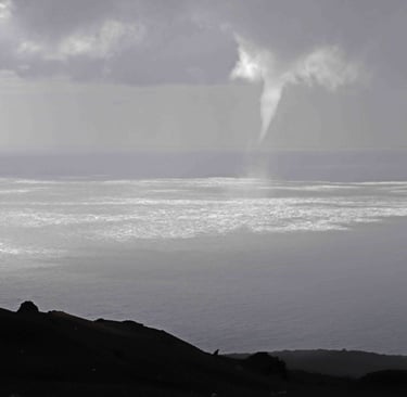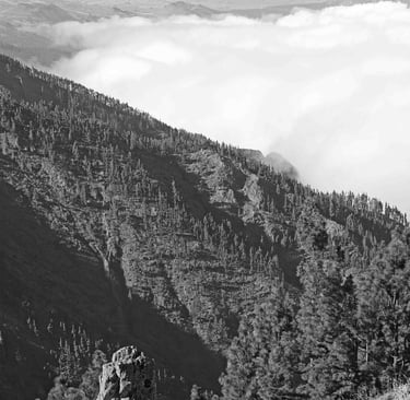 Le lendemain, mauvais temps annoncé; du coup je vais seul tenter ma chance du côté d'El Pilar dans un premier temps; un immense parking, des chemins de randonnée qui par-tent dans tous les sens et des randonneurs partout brandissant leurs battons de ski malgré la pluie qui commence à mouiller. J'opte pour la route des volcans en direction du sud. Mais après quelques kms dans les sapins, une visibilité réduite par lesdits sapins et une brume qui s'épaissit de plus en plus, je préfè- re tenter ma chance du côté de la LP-4 qui grimpe au Roque de Los Muchachos. A plus de 2 500m d'altitude, j'ai une chance d'être au dessus des nuages. et d'avoir une meilleure visibilité. Une fois redescendu au niveau de la mer sur Santa Cruz, il faut remonter, dans une épaisse forêt de pins, jusqu'à ce qu'on émerge. C'est beaucoup mieux côté mer; par